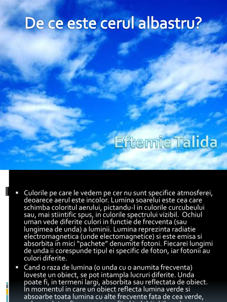 De Ce Cerul Este Albastru AnideÈcoalÄ Ro Source from : https://anidescoala.ro/divertisment/stiati-ca/altele/de-ce-cerul-este-albastru/ De asemenea, este culoarea cerului senin. De ce e cerul albastru?! Aceste efecte combinate fac ca cerul sa fie albastru. Vă rugăm, să tratați pagina ca atare! Pur si simplu noi oamenii suntem mai sensibili la.